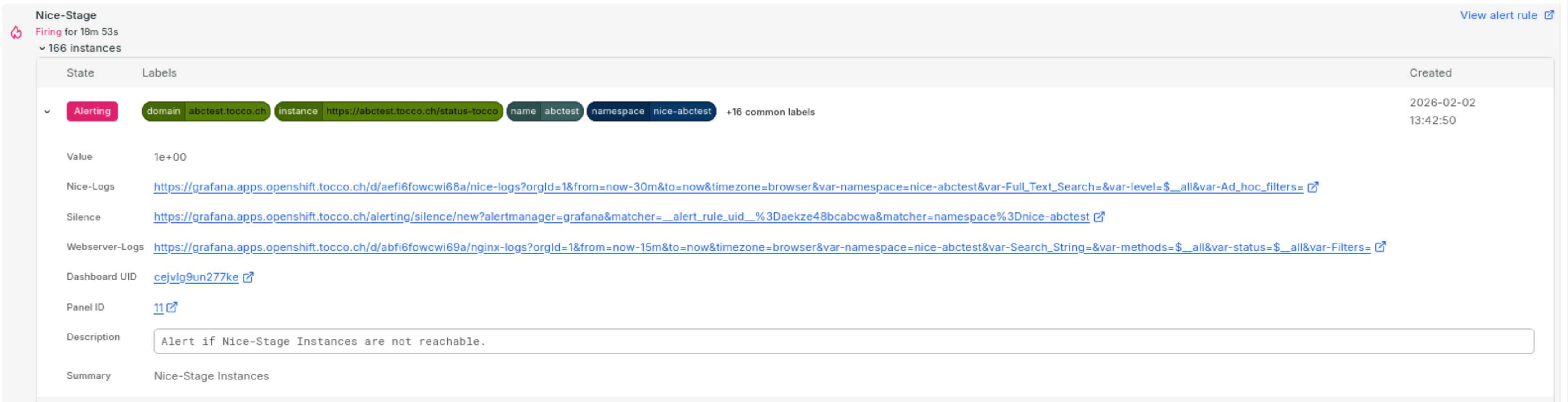 Alert rules [1] for Nice and WordPress installations are defined at Alert Rules under the Grafana-managed section and inside the OnCall_Alerts folder.